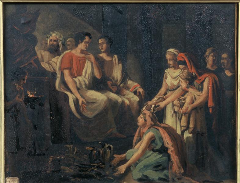 scène historique (homme, assis, trône, homme politique, femme, agenouillé, don : bijou, cité, Rome, la guerre, antiquité : Romain, palais : intérieur)