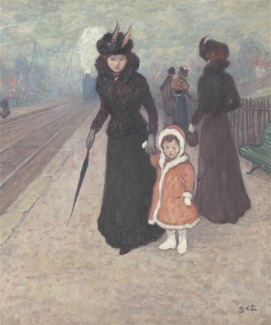 scène (femme, enfant, voyageur, gare, voie ferrée, locomotive, feuillu, maison)