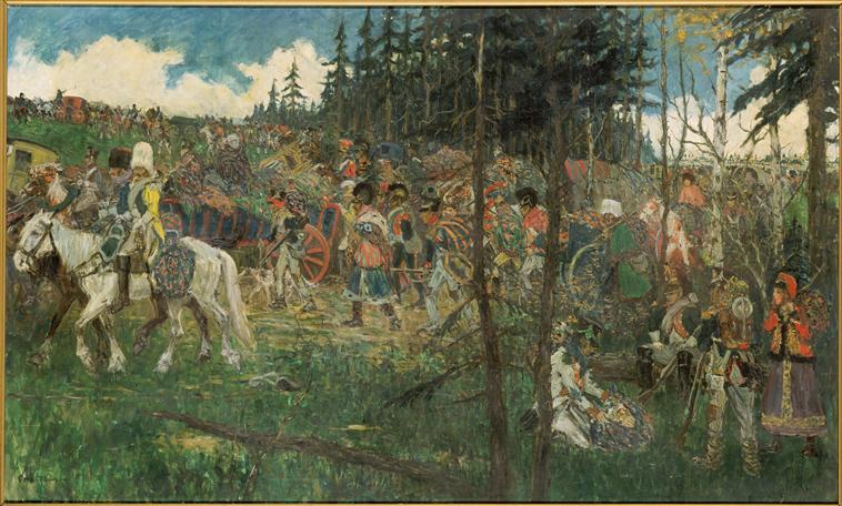 scène historique (retraite, soldat, cavalerie, infanterie, Français, pillage, retraite de Russie, voiture à attelage, chien, bouleau, sapin)