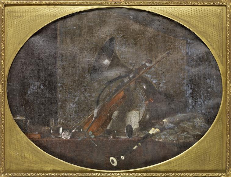 nature morte (instrument de musique, cor, livre, gobelet : verrerie)