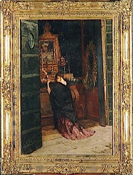 scène (femme, prière, autel, objet du culte, fleur) ; peinture (Vierge)