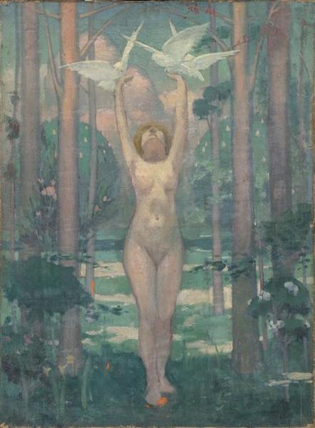 figure (femme : nu, en pied, de face, colombe) ; fond de paysage (feuillu)