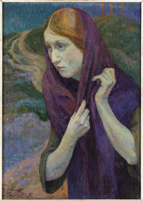 figure biblique (sainte Madeleine, à mi-corps, de trois-quarts, coiffe, chemin)