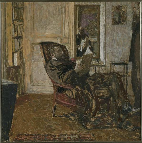portrait collectif (Natanson Thadée, homme, assis, de trois-quarts, lecture, siège) ; Roussel Ker Xavier (en pied, de profil) ; miroir (autoportrait, Vuillard Edouard)