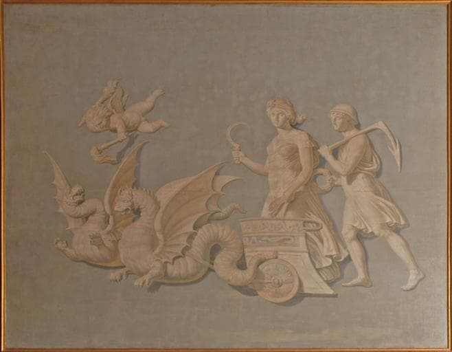 figure mythologique (Cérès, attribut : faucille, couronne : blé, gerbe : blé, char myth : dragon) ; agriculteur (homme, couronne : blé) ; putto (torche)