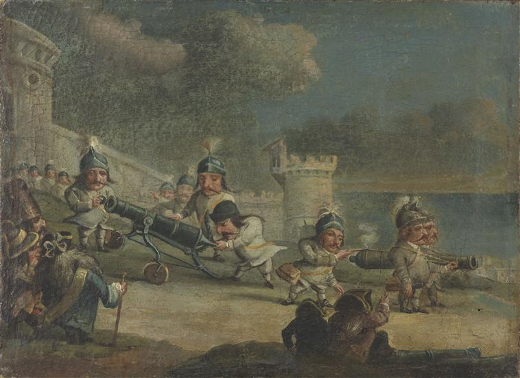 caricature (nain, soldat, artillerie, état-major, vêtement, armure, canon) ; château (fortification, guerre de siège)