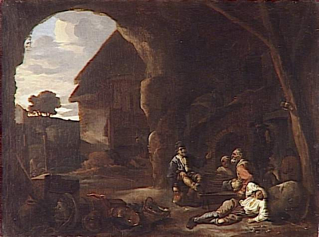 scène (homme, sommeil, conversation, grotte, tonneau, récipient : cuivre, pot : céramique, panier : vannerie, légume) ; chaumière ; feuillu