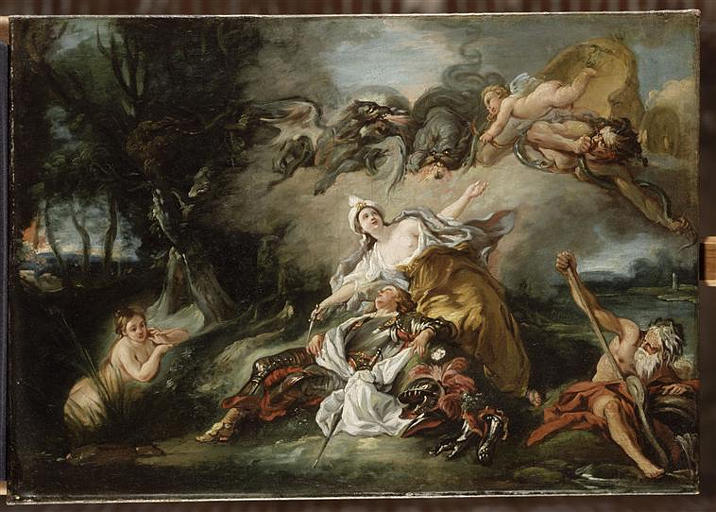scène (Armide, nudité, magie, poignard, meurtre, Renaud : soldat : croisade, armure, sommeil, vieux, allégorie : cours d'eau, Eros, char myth : dragon, femme, serpent) ; fond de paysage (feuillu, cours d'eau, plante aquatique, colline)