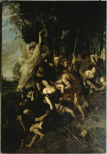 scène (supplice, ensevelissement : femme, prêtre : paganisme, outil agricole, lance, casque, symbole : régime politique, torche, lampe) ; feuillu ; clairière