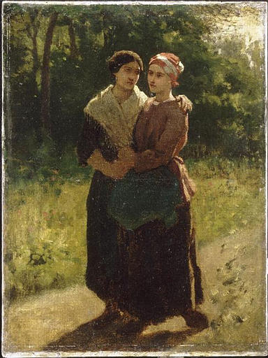 groupe de figures (jeune fille, en pied, de trois-quarts, amitié, bijou, couvre-chef) ; forêt (feuillu, chemin)