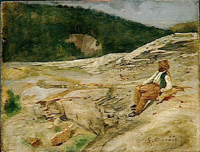 paysage (rocher, forêt, herbe, homme, repos)