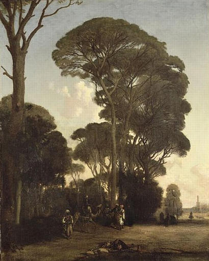 paysage (feuillu, palmier, cheval, chameau, harnachement, mosquée)