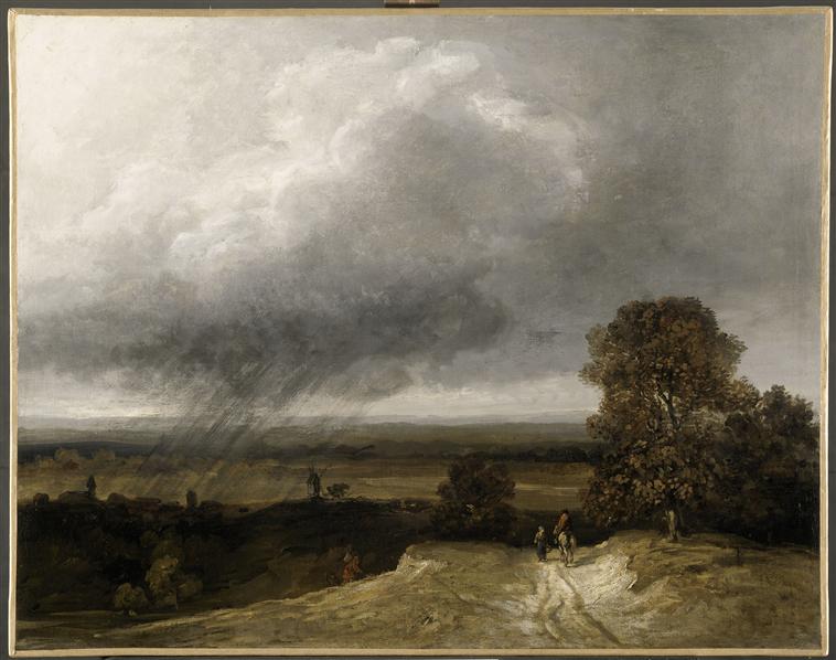 paysage (cours d'eau, feuillu, moulin à vent, chemin, cavalier, homme, bâton : la marche, femme, panier : vannerie)