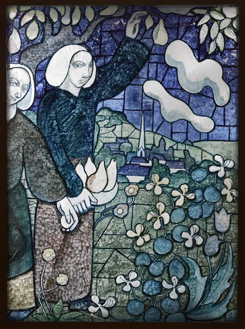 scène (femme, cueillette : poire, fleur) ; maison ; église ; feuillu