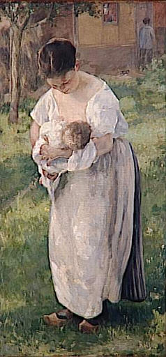 figure (femme, en pied, de face, allaitement, nourrisson) ; chien ; feuillu