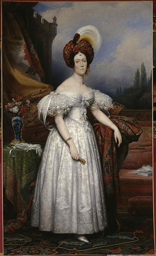 portrait (femme, en pied, de trois-quarts, bijou, éventail, dentelle, mobilier, effet de tissu, vase : céramique, fleur, livre) ; feuillu ; tour