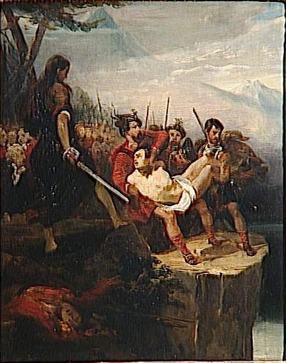 scène (homme : nudité, peine de mort : noyade, soldat : Ecossais, arme, armure, femme : épée, expression du visage) ; falaise ; montagne ; lac ; feuillu