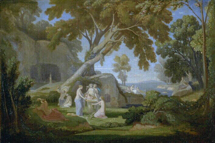 scène mythologique (Bacchus, nourrisson, femme) ; fond de paysage (rocher, grotte, arbre)