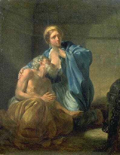 Beaufort illustre un texte de Valère-Maxime (Livre V, 4 ext. 1) qui sous le titre 'De pietate in parentes ', parle de Cimon, un vieillard emprisonné qui attendait son exécution et n'était plus nourri ; le geôlier autorisa la fille de Cimon, Pera, à lui rendre visite. Elle le nourrit en lui donnant le sein. Cet exemple de piété filiale de la littérature antique est un de ceux qui inspira le plus les artistes entre le XVIème et le XVIIIème siècle, notamment Rubens qui peint plusieurs versions de ce thème. En 1767, celle de l'Ermitage figure à la vente Jullienne à paris, et cette même année, Bachelier et Lagrénée traitent le sujet. Notre tableau, peint dix ans plus tard pour le Salon (reconnu en 1980 grâce aux dimensions), est à rapprocher de la version de Rubens conservée au Rijksmuseum d'Amsterdam (gravure de Willem Pannels) où Pera serre son père avec son bras droit contre son sein tout en détournant la tête. J. Locquin (in La peinture d'histoire en France de 1747 à 1785, Arthema, 1978 ; p. 251) observe qu'à partir de 1775 les sujets d'histoire ancienne augmentent dans des proportions considérables et que les peintres sacrifient inconsciemment au dogme du beau idéal quand il ne s'y rallient pas résolument (id. p. 254). Parmi eux, il ajoute que Beaufort est un des seuls qui soit resté fidèle à ses traditions et que préfigurant les romantiques, il recherche les effets d'ombre et de lumière et privilégie la couleur interprétant certaines visions de l'âme avec les ressources dramatiques du clair-obscur. Si les peintures dramatiques sur ce sujet représentent plutôt une allégorie de la jeunesse et de la vieillesse soulignant fréquemment l'aspect sexuel, à la fin du XVIIIème siècle, Beaufort le traite en tant qu'exemple rural de piété filiale selon la signification originelle. Cité comme un petit tableau par les commentateurs du Salon de 1777, il est ' grand ' dans son propos. (B. de Boysson/catalogue des peintures du XVIIIème siècle au Musée des Beaux-Arts de Bordeaux - non publié -)