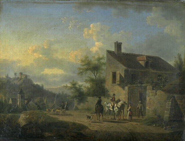 scène (conversation, cavalier, femme, homme) ; chien ; mouton ; fond de paysage (église, colline, feuillu)