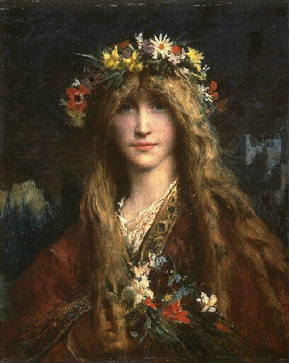 figure (femme, de face, en buste, couronne : fleur, anémone, marguerite, jacinhe, représenté en : Ophélie) ; fond de paysage (de fantaisie)