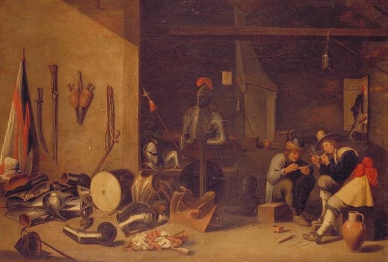 vue d'intérieur (salle, arme offensive, arme défensive, tambour) ; scène (homme, fumeur, pot, conversation)
