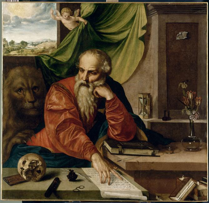 figure (saint Jérôme, assis, prière, livre, crâne, sablier, effet de tissu, ange, lion, tête, fenêtre) ; fond de paysage