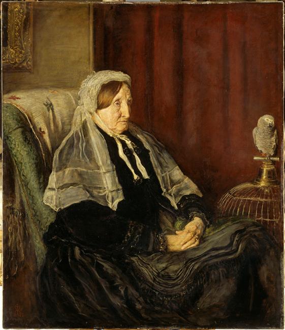portrait (Heugh Mrs, vieille, Anglais, assis, de trois-quarts, coiffe, fauteuil, perroquet, cage, rideau)