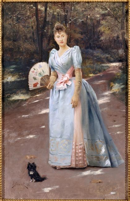 portrait d'inconnu (femme, en pied, éventail, chien) ; fond de paysage (jardin)