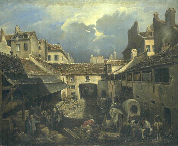 vue d'architecture (ville, Bordeaux, cour, transport routier, charrette : cheval, conducteur, repos)
