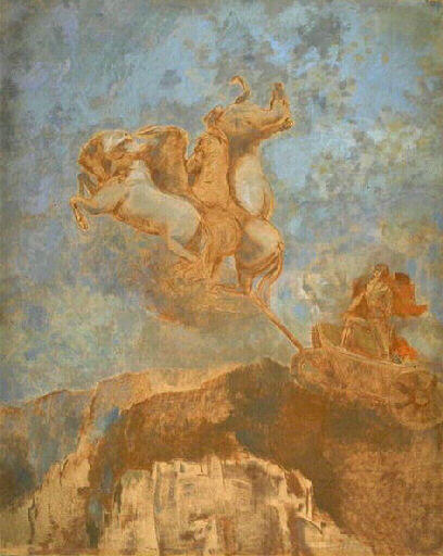 En 1878, Redon est émerveillé par le plafond de la Galerie d'Apollon (Louvre) où Delacroix, d'une façon étonnamment baroque, met en scène le combat qui conduira Apollon à tuer de ses flèches le dragon Python, libérant ainsi la ville de Delphes. Redon écrit ainsi son admiration devant l'ampleur que prend le sujet, du fait de la portée symbolique et du pouvoir évocateur de la couleur : 'C'est le triomphe de la lumière sur les ténèbres. C'est la joie du grand jour opposée aux tristesses de la nuit et des ombres et comme la joie d'un sentiment meilleur après l'angoisse (...). L'attribut de chaque dieu devient inutile, tant la couleur se charge de tout dire et d'exprimer juste'.Lorsqu'il traite le thème du Char d'Apollon, Redon épure considé-rablement la composition : il ne retient du plafond de Delacroix que le motif des quatre chevaux cabrés dans un mouvement violent, le char et le dieu au manteau flottant qui dirige son quadrige. Le serpent ici a disparu.Un autre mythe a vivement impres-sionné Redon : celui de la chute de Phaéton, au moment où le fils du Soleil, quittant la route tracée dans l'espace, est foudroyé par Jupiter. Dès 1896, le Char du Soleil est représenté basculant dans l'abîme dans la planche XVI de la Tentation de saint Antoine. Les deux thèmes, mythe de Phaéton et légende d'Apollon, ont été traités parallèlement et à maintes reprises par Redon, jusque vers 1910. On retrouve le Char d'Apollon pour la dernière fois dans le panneau Le Jour exécuté pour la Bibliothèque de l'Abbaye de Fontfroide, et achevé à l'automne de 1911. 'Un fantastique décor de rochers rouges aux replis profonds', voilà ce qui fait la particularité de cette version du char d'Apollon. La vision surgit du contraste entre la couleur rouge d'argile des roches, du char et des chevaux, et le bleu évanescent du ciel dans lequel montent les coursiers divins, y déployant leur force vigoureuse soudain libérée des lois de la pesanteur. Redon renoue avec les thèmes formulés instinctivement par Delacroix. Apollon devient l'Esprit victorieux des ténèbres dans l'envol de son char : c'est une allégorie. En même temps, les lignes et les couleurs jouent un rôle symbolique. Les chevaux cabrés d'Apollon reprennent, mais en l'accomplissant, la course de Phaéton vers la source lumineuse. Dans toute la série de ses Chars d'Apollon, Redon parvient à l'ultime phase de son art de visionnaire et de poète. La couleur, d'abord récusée dans ses 'Noirs', alors que Redon vivait dans un monde de phan-tasmes angoissants, resurgit au tournant du siècle et exprime à la fois une joie, un apaisement ainsi que 'l'irradiation suprême de l'Esprit'. Elle est associée à l'accession à un monde spirituel. L'élan du Char d'Apollon est presque vertical, et cette ascension vers la lumière correspond au cheminement moral de l'artiste vers la fin de sa vie
