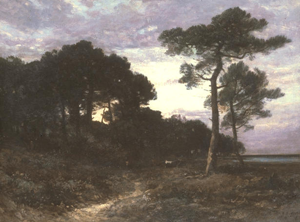 E. Vallet 'Le tableau qui a été exécuté en 1874, représente une lisière de forêt de pins au soleil couchant. On aperçoit à droite le bassin d'Arcachon ou l'étang de Lacanau. [...]' Le crépuscule d'orage sur la forêt landaise, aux touches larges et à la peinture onctueuse rappellerait 'l'émail' de Courbet