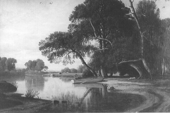paysage (cours d'eau, barque, arbre, homme, sommeil, vache)
