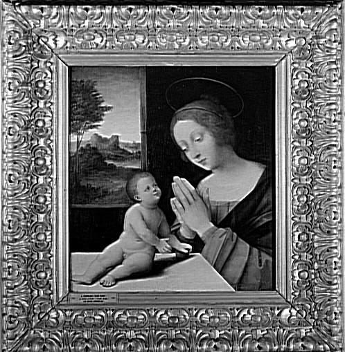 figures bibliques (Vierge, prière, en buste, Enfant Jésus, nu, pomme) ; paysage