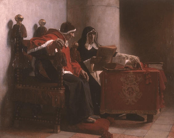 scène (lecture, feuillet, juge, pape, trône, fauteuil, inquisition)
