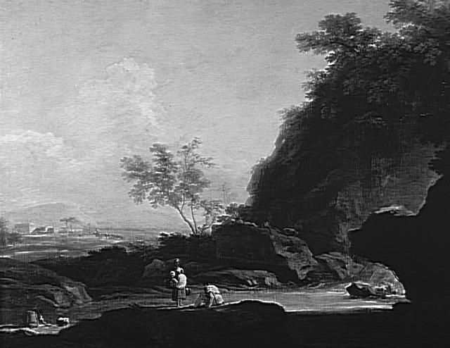 paysage (cours d'eau, grotte, feuillu, lever du jour) ; personnage