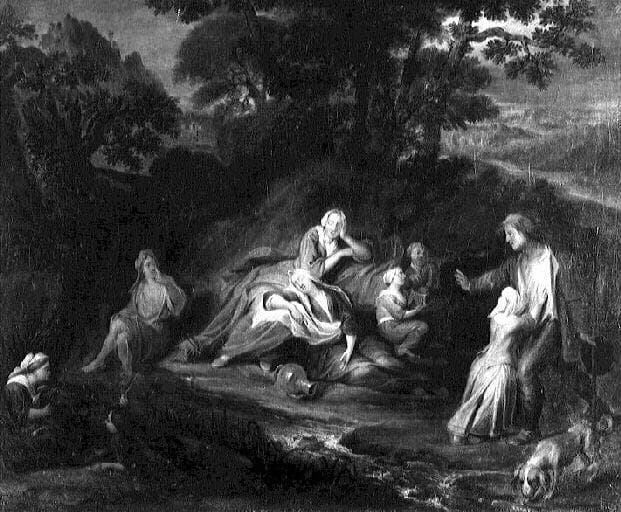 scène (repos, paysan, cours d'eau, chien) ; fond de paysage (feuillu)