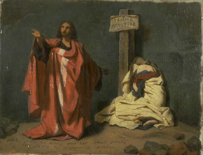 inscription en bas à gauche : 'Que celui de vous qui est sans péché / lui jette la première pierre'