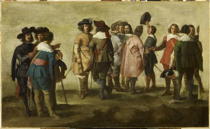 groupe de figures (homme, conversation, vêtement : époque Louis XIV, chapeau, épée)