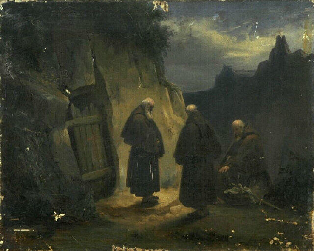 groupe de figures (moine, assis, discussion) ; fond de paysage (montagne, grotte)
