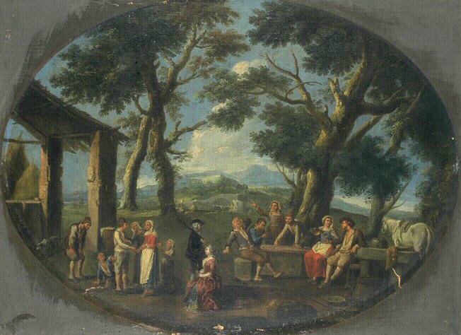 L'oeuvre était traditionnellement donnée au romain Andrea Locatelli, mais vers 1953 une restauration a permis d'enlever un repeint qui recouvrait le motif caractéristique des deux personnages aristocratiques placés au milieu de la composition (sans doute cachés dans le but de donner au tableau l'allure d'une bambochade plus nettement dans le goût du XVIIème siècle). On s'aperçut que cet ovale avait un pendant, une scène de vendanges comportant aussi un couple d'observateurs élégants, qui avait également fait partie de la collection Campana et du musée Napoléon III, et dont celle-ci constituait en somme la suite; le pendant est conservé aujourd'hui à Rome dans la collection Andrea Busiri Vici sous le nom convaincant de Paolo Monaldi, un élève, actif dans les années 1760, de Locatelli, qui forma également Joseph Vernet. L'attribution à Monaldi de la scène conservée à Bordeaux a été confirmée par F. Zeri ; restauré en 1968