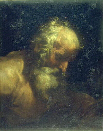 P. Rosenberg (com. or.) confirme que ce tableau ne peut être bolonais et R. Pallucchini l'accepte comme vénitien du XVIIème siècle, mais A. Brejon remarque avec raison la ressemblance de cette assez bonne esquisse avec le buste de 'Apôtre écrivant' ( Dijon, musée des Beaux-Arts) de Gian Antonio Pellegrini (Venise 1675 - id. 1741), dont on retrouve ici la touche saccadée, vibrante et les contours vaporeux, associés à d'intenses effets lumineux. M. Guillaume (1980) signale d'autres personnage de ce type chez G.A. Pellegrini : dans le 'Jephté salué par sa fille après la bataille' (Londres, coll. Denis Mahon) et le 'Martyre de Saint André (Venise, église San Stae).; restauré par le peintre Jean-Baptite Pierre Lebrun (1748-1813), avant 1813