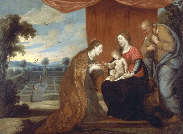 scène (symbole : mariage religieux, sainte Catherine d'Alexandrie, Vierge, Enfant Jésus, anneau, saint Joseph, épée) ; fond de paysage (parc)