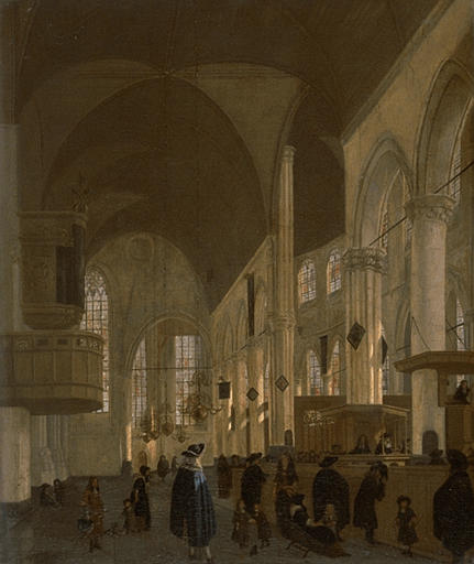 vue d'intérieur (temple : protestantisme, fidèles, vitrail)
