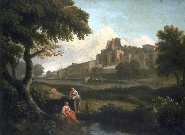 paysage (feuillu, fontaine, femme, pré, bovin, garde, village) ; vue d'architecture (ruines)