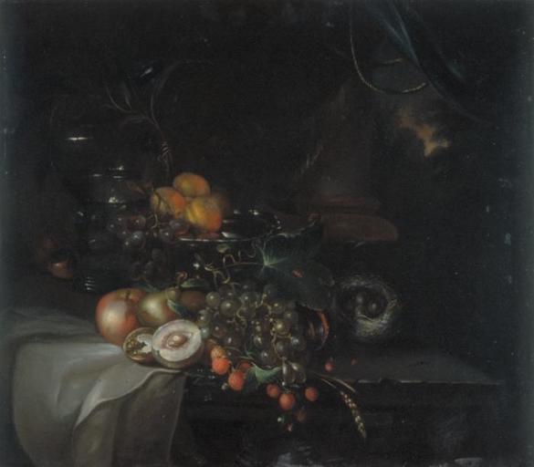 nature morte (raisin, pêche fruit, fruit, noix, fraise, abricot, blé, abri d'animal : oiseau, oeuf)