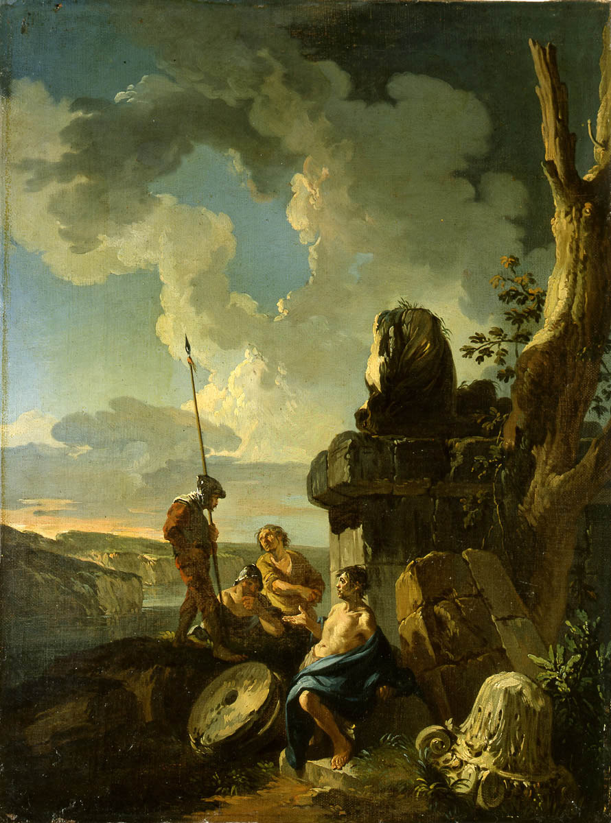 paysage (montagne, rocher, tronc, ciel) ; vue d'architecture (ruines, chapiteau) ; figure (soldat)