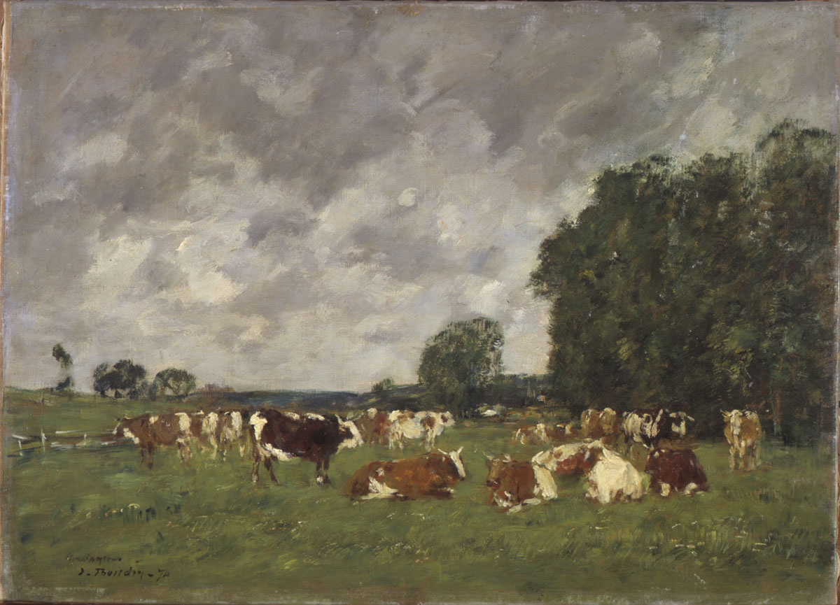 représentation animalière (bovin) ; paysage (pré, feuillu, ciel, nuage, Fervaques)