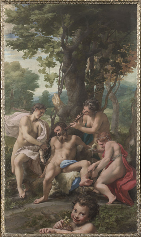 commandé en 1529-1530 par Isabelle d'Este pour son studiolo au palais ducal de Mantoue ; autres éléments de la décoration conservés également au Louvre : le pendant, allégorie des vertus par Corrège, allégorie de la cour d'Isabelle d'Este par Lorenzo Costa, le règne de Comus, commencé par Mantegna, achevé après sa mort par Lorenzo Costa, Mars et Vénus dit le Parnasse par Mantegna, Minerve chassant les vices du jardin de la vertu par Mantegna, le combat de l'Amour et de la Chasteté par Pérugin ; numéros d'inventaire des autres éléments : inv 5926, inv 255, inv 256, inv 370, inv 371