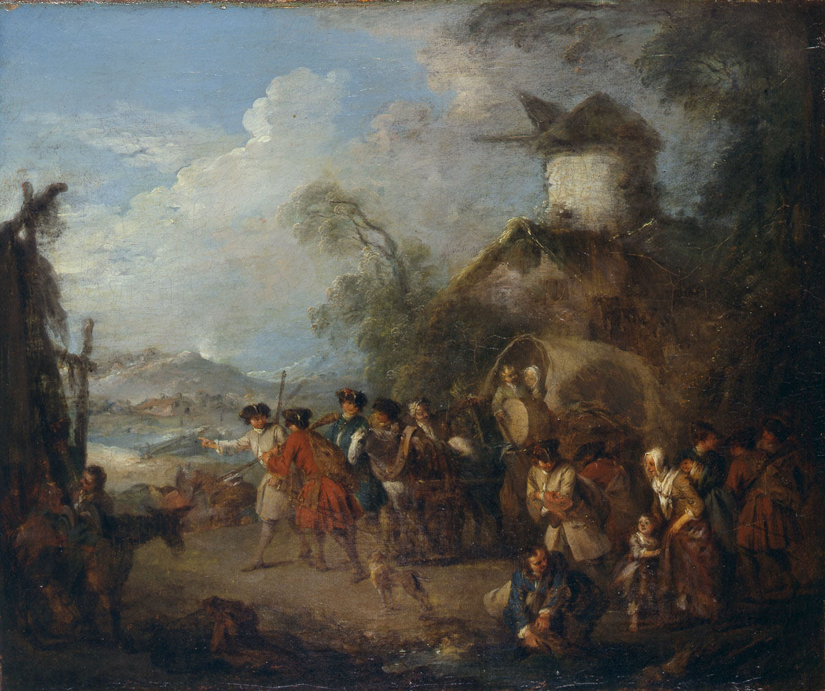 scène (mouvement d'armée, femme, enfant, voiture à attelage : cheval, chemin) ; fond de paysage (maison, feuillu, montagne)